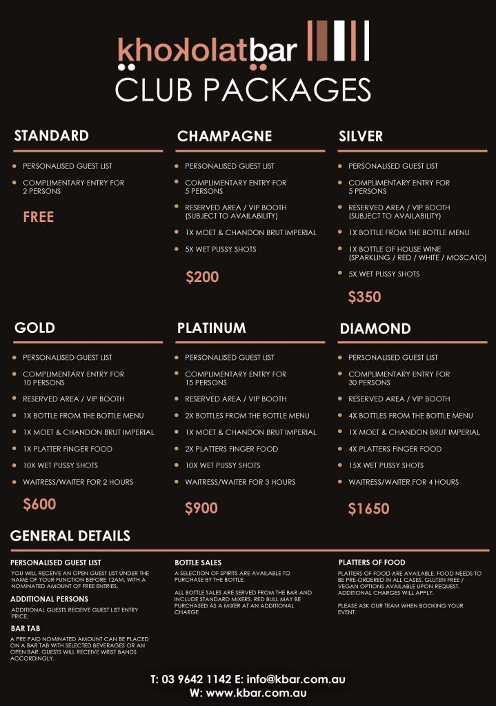 Khokolat Bar Address: 43 Hardware Lane, Melbourne Phone: 03 9642 1142 Email: info@kbar.com.au